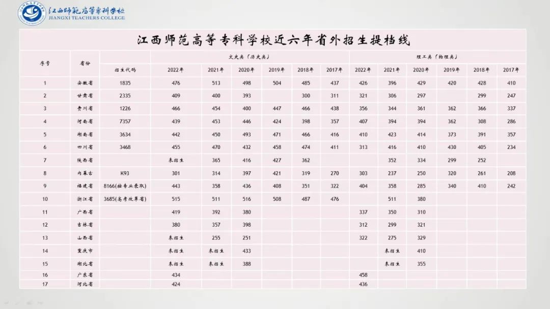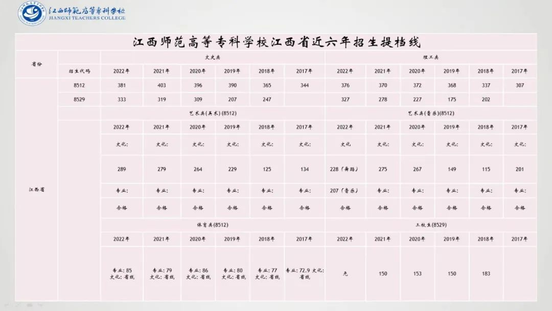 温馨提示:2023年高考进入倒计时,点击下载掌上高考app,获取各省历年真题、真题答案、详细解析。查分数、查专业、一键填报志愿。助力高考,金榜题名!江西师范高等专科学校2023年招生简章已经发布,想要了解这所学校的考生可以仔细阅读简章中的各项招生细节。2023年高考即将到来,预祝各位考生取得理想成绩,金榜题名!近六年学校招生提档线如下,供各位考生参考!