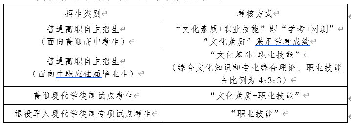 实行“文化素质+职业技能” 考核方式,普通高中学生综合素质评价作为招生重要参考。文化素质考试除人才培养特殊需要的专业外,均采用普通高中学业水平考试成绩(满分值为450分)。职业技能考核为职业适应性测试,采用“网上职业适应性联合测试”(下称“网测”,满分值为100分)方式。