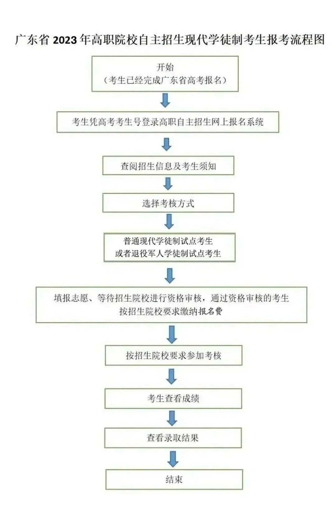 5月11日至14日,考生凭高考报名号及密码登录“广东省2023年高职院校自主招生网上报名系统”(下称“网上报名系统”,网址:https://pg.eeagd.edu.cn/gzks/)报名,签订《诚信考试承诺书》,在 “普通现代学徒制试点”(不分考生类型)、“退役军人现代学徒制专项试点”(不分考生类型)考核方式中选择一种填报志愿、缴交报名费,录入相关报名信息、上传有关证明材料(原件扫描版)。考生报考流程图详见附件。