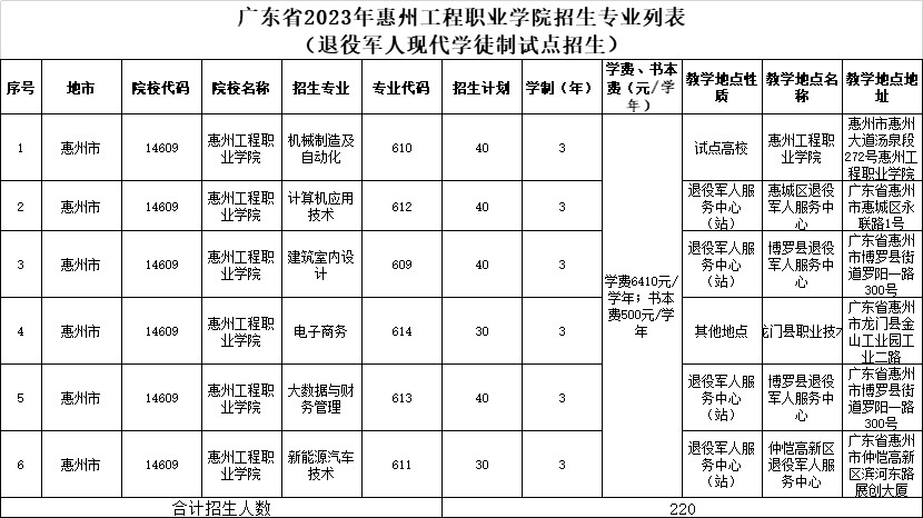 2023年惠州工程职业学院退役军人现代学徒制招生计划