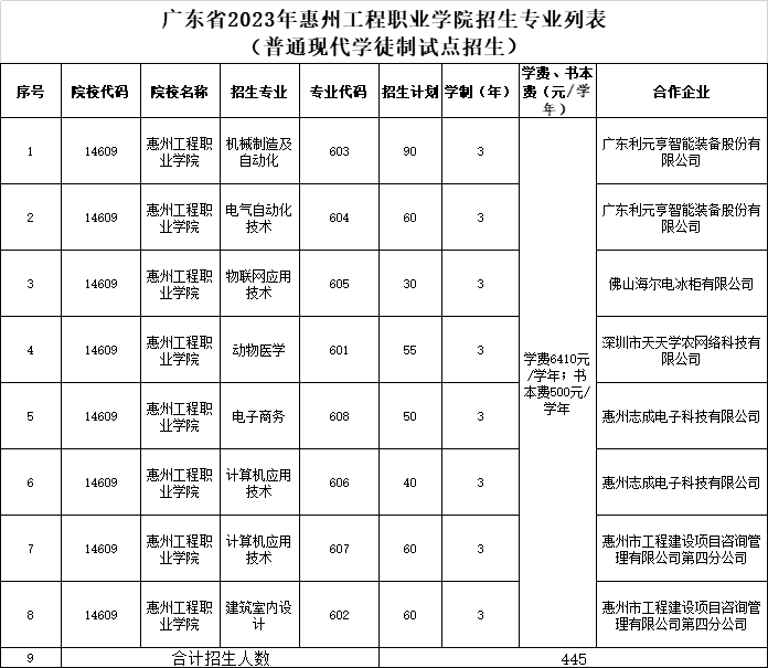 2023年惠州工程职业学院普通现代学徒制招生计划