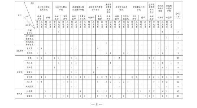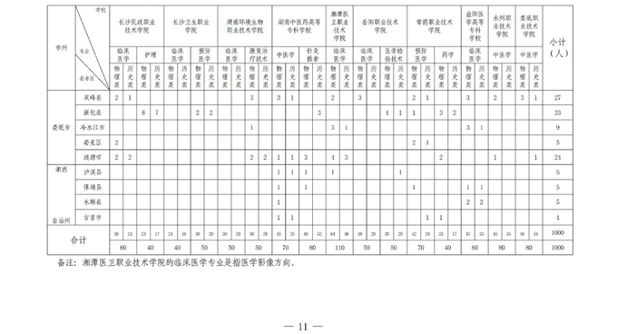 2023年,省级财政出资计划培养招生1000名。省卫生健康委、省教育厅委托我省开设有医药卫生类专业的长沙民政职业技术学院、长沙卫生职业学院、湖南环境生物职业技术学院、湖南中医药高等专科学校、湘潭医卫职业技术学院、岳阳职业技术学院、常德职业技术学院、益阳医学高等专科学校、永州职业技术学院、娄底职业技术学院等10所全日制高职(专科)院校进行培养(以下简称“培养学校”)。根据区域卫生人才发展规划和各地实际需求,省卫生健康委、省教育厅在综合平衡的基础上,编制了《2023年湖南省基层医疗卫生机构本土化专科层次人才培养分学校分类别分县市区招生来源计划表》(详见附件)。上述各院校招生计划均纳入本校年度招生总计划。