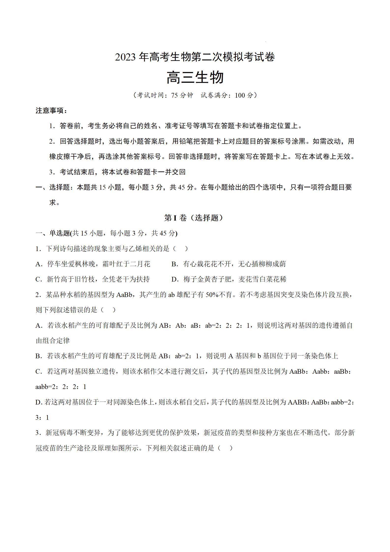 2023年高考重庆生物第二次模拟试题