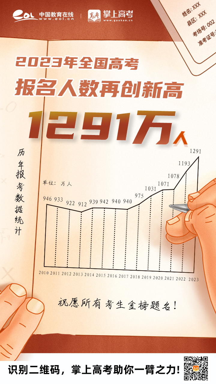温馨提示:不懂志愿填报怎么办?掌上高考人工智能帮你选!点击此处,一键填报!更快了解冲、稳、保院校名单!2023年全国高考报名人数1291万人,比去年增加98万人,再创历史新高。教育部会同国家教育统一考试工作部际联席会议成员单位,统筹谋划,周密部署,指导各地精心做好考试组织和考生服务工作,全力以赴实现“平安高考”目标任务。