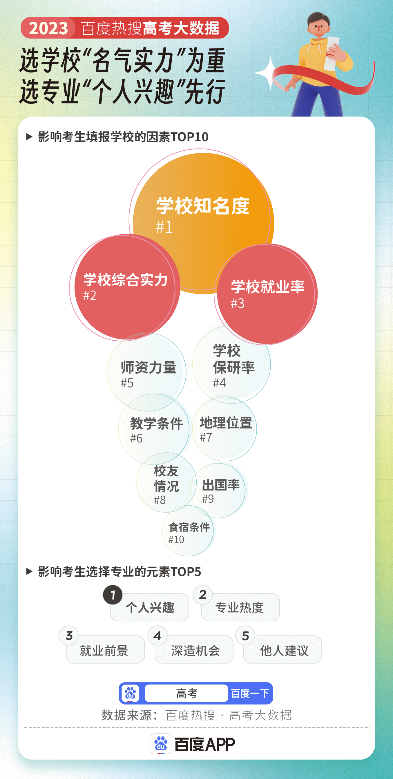 从高校热度到专业选择,百度热搜大数据真实反映了社会环境、市场需求、考生观念影响下的备考实况,描绘了2023年高考的数字全景。掌握真实、全面的高考动态,对于缓解考前焦虑、开拓选择空间有重要价值,在百度APP搜索“高考”或相关词条,可获得全面、及时、权威的高考信息和智能化高考服务,助力考生科学做出兼顾兴趣与职业发展的理想选择。