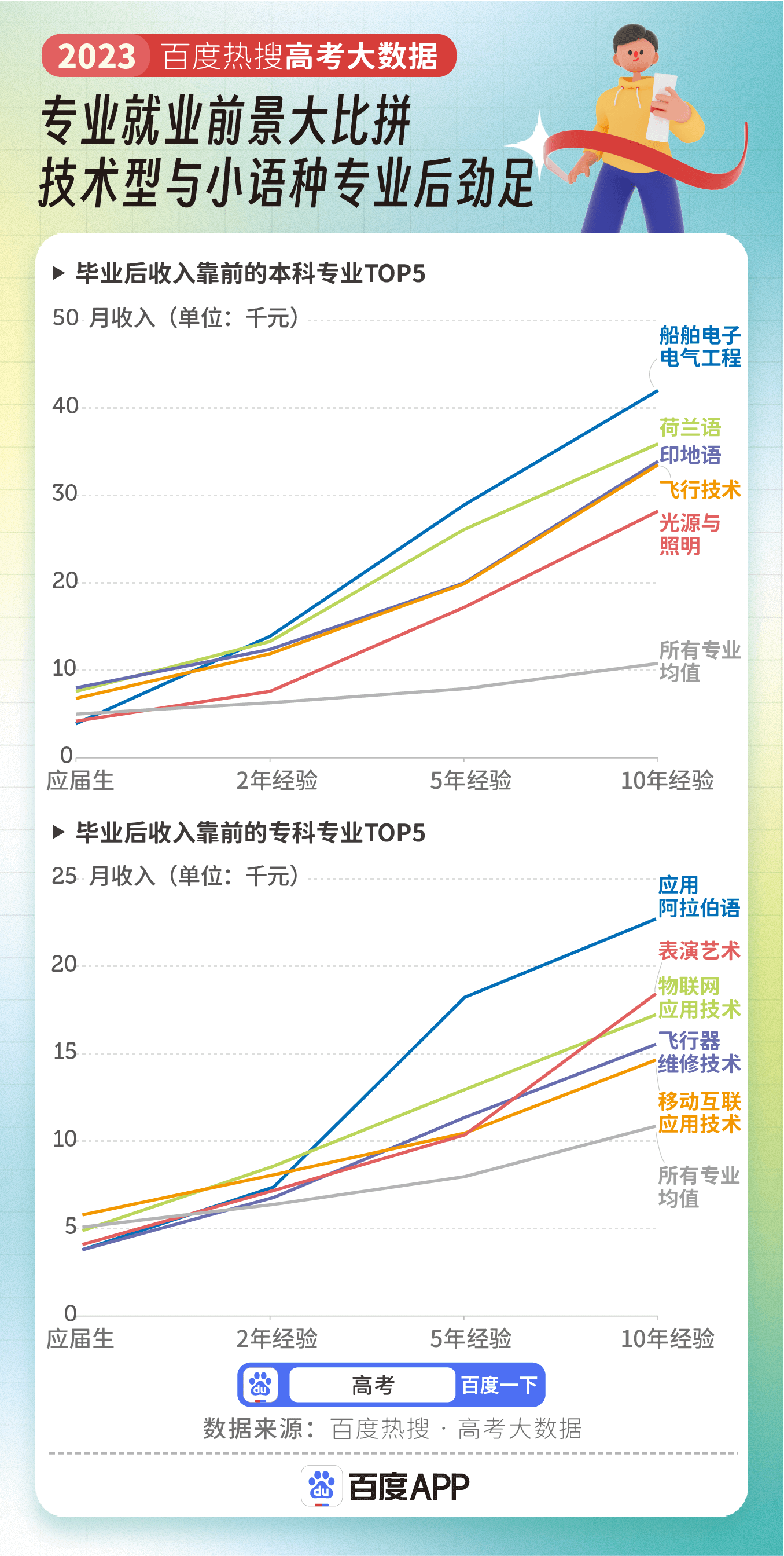 着眼于未来,百度热搜大数据还整理了就业“钱”景最佳的专业。船舶电子电气工程、荷兰语、印地语、飞行技术、光源与照明位列就业前景最佳本科专业前五,应用阿拉伯语、物联网应用技术、飞行器维修技术、移动互联应用技术、表演艺术位列就业前景最佳专科专业前五。数据显示,如上专业的毕业生在对口领域的收入,将随着就业年限的增长与其他专业毕业生拉开大幅差距。
