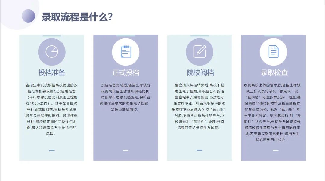 投档准备完成后,省招生考试院根据高校招生计划和投档比例,按照平行志愿投档规则,将符合高校招生要求的考生电子档案一次性投放给高校。