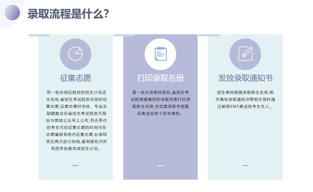若一轮投档后院校的招生计划还未完成,省招生考试院则会组织征集志愿,征集志愿时学校、专业及缺额数会在省招生考试院官方网站与微信公众号上公布,符合条件的考生可在征集志愿的时间内在志愿填报系统内征集志愿,补报结束后再次进行投档,直到该批次所有的学校都完成招生计划。