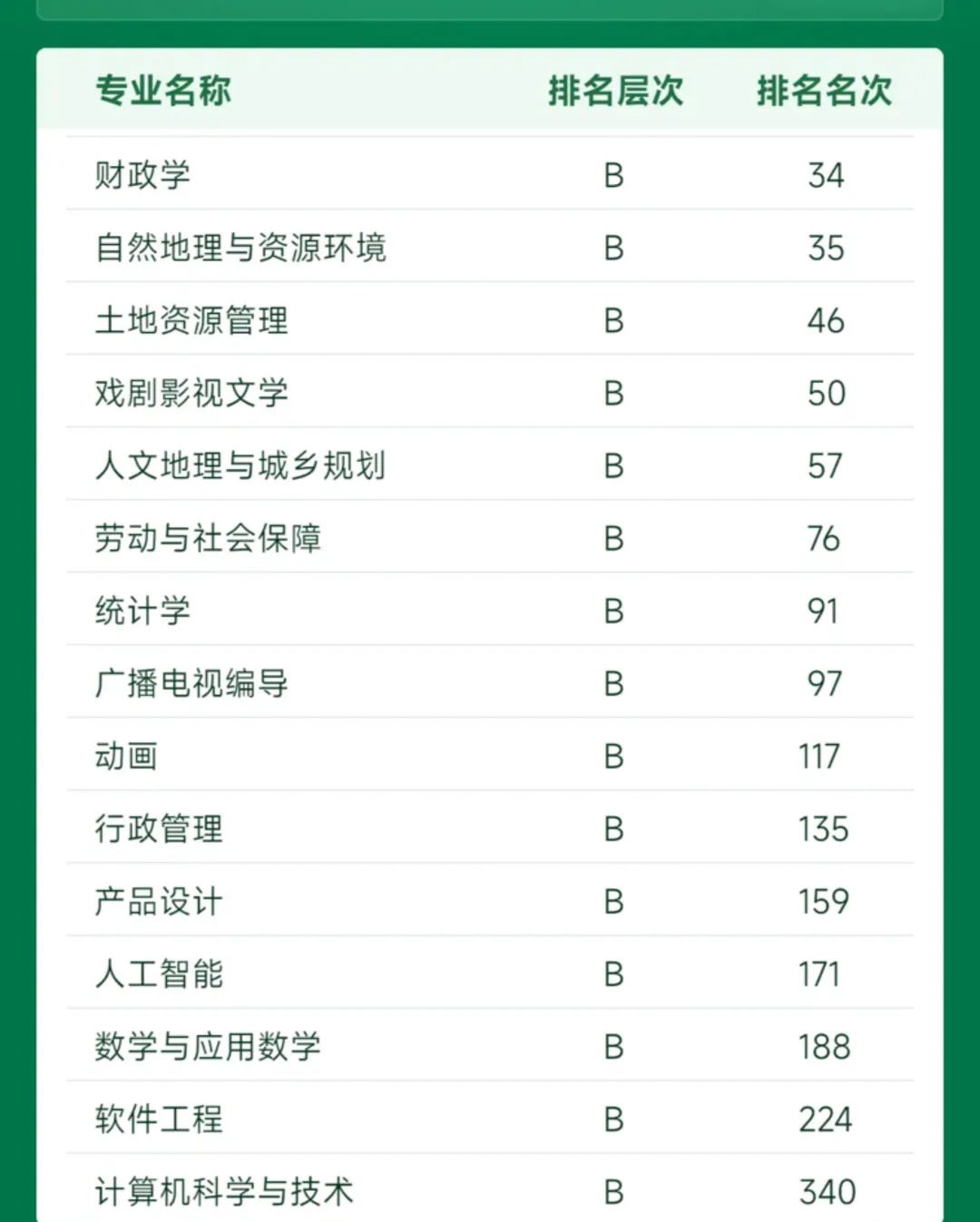 财政学、统计学、人工智能、数学与应用数学、人文地理与城乡规划、城市管理、戏剧影视文学、广播电视编导、动画、产品设计等16个专业获评为B级,排名进入全国前50%。
