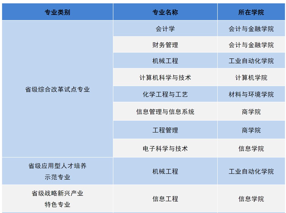 经过多年的专业建设,学校现有1个广东省特色重点学科、2个广东省重点培育学科, 3个市级优势学科, 3个校级优势学科。获批有1个国家级一流本科专业建设点,7个省级一流本科专业建设点;建设有7个IEET工程及科技教育认证专业,8个省级综合改革试点专业,1个省级应用型人才培养示范专业、1个省级战略新兴产业特色专业、6个省级特色专业。学科专业的结构和布局强有力地支撑广东省“制造业当家”,珠海市“产业第一”的发展目标和战略布局。部分优势专业如下表所示: