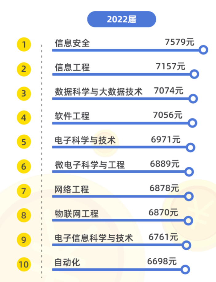 据麦可思研究发布的就业蓝皮书显示,信息安全、信息工程、数据科学与大数据技术、软件工程、电子科学与技术等专业表现十分抢眼。其中,2022年的信息安全专业毕业生平均薪资高达7579元,位列第一位;第二的是信息工程专业,工资高达7157元;数据科学与大数据技术专业及软件工程专业分别以月薪7074元、7056元霸榜第三、第四名。