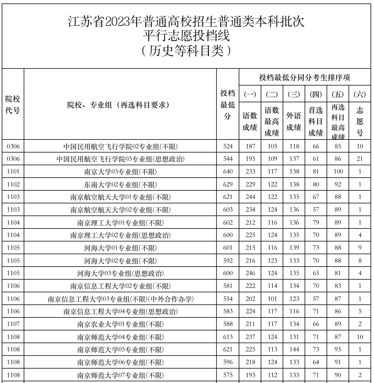 江苏省2023年普通类本科批次平行志愿投档线公布!(历史、无物理等科目类) 点击查看历史类完整版投档分数线