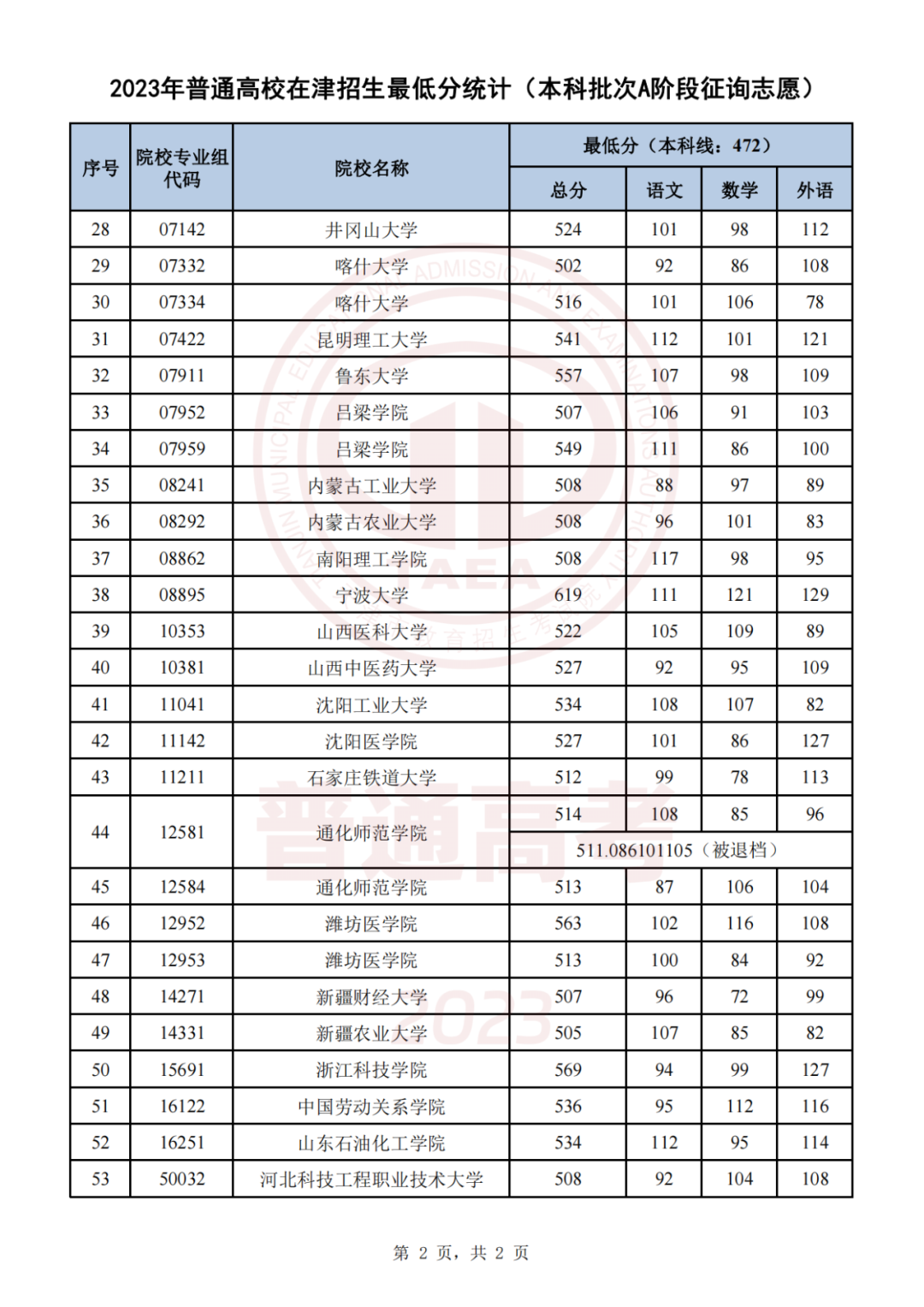 天津市2023年普通高校招生本科批次A阶段征询志愿、艺术类本科批次征询志愿及体育类本科批次征询志愿录取工作已结束。7月25日15时起,考生可以通过登录招生院校网站、招考资讯网(www.zhaokao.net)、微信小程序“天津招考”、全国一体化在线政务服务平台、津心办APP、津云客户端、中国建设银行APP等多种途径查询征询志愿的录取结果。现将征询志愿最低分统计公布如下: