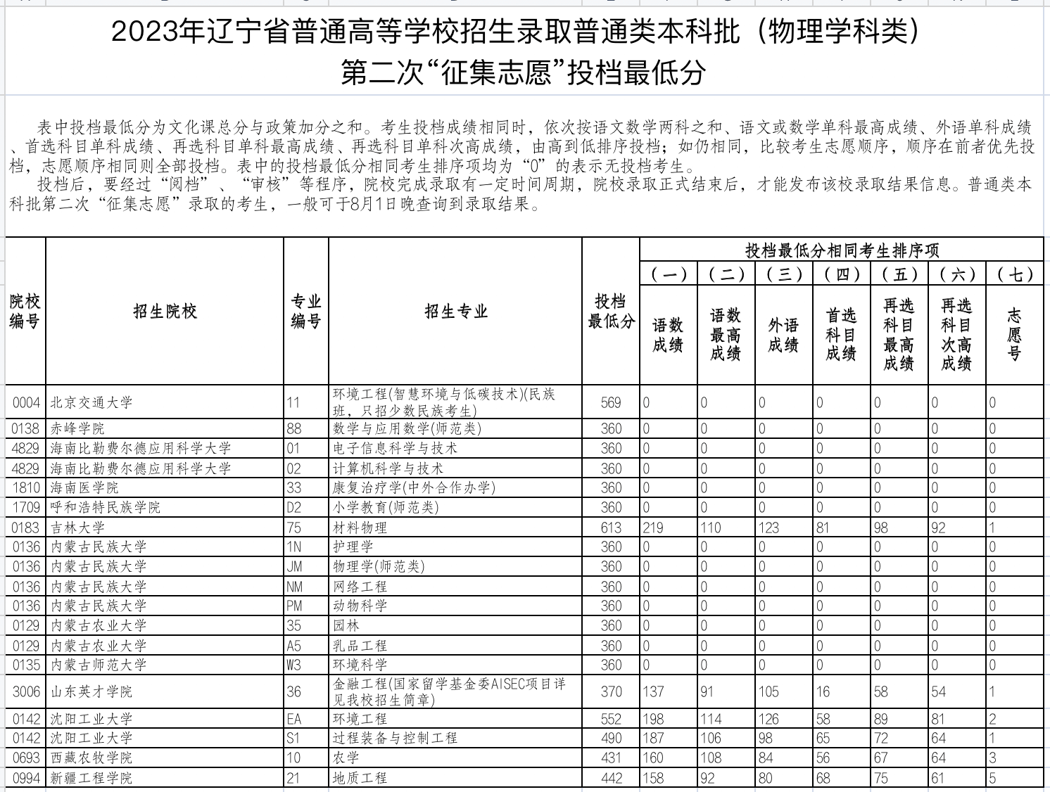 2023年辽宁省普通高等学校招生录取普通类本科批(历史学科类)第二次“征集志愿”投档最低分(点击链接查看完整版)2023年辽宁省普通高等学校招生录取普通类本科批(物理学科类)第二次“征集志愿”投档最低分