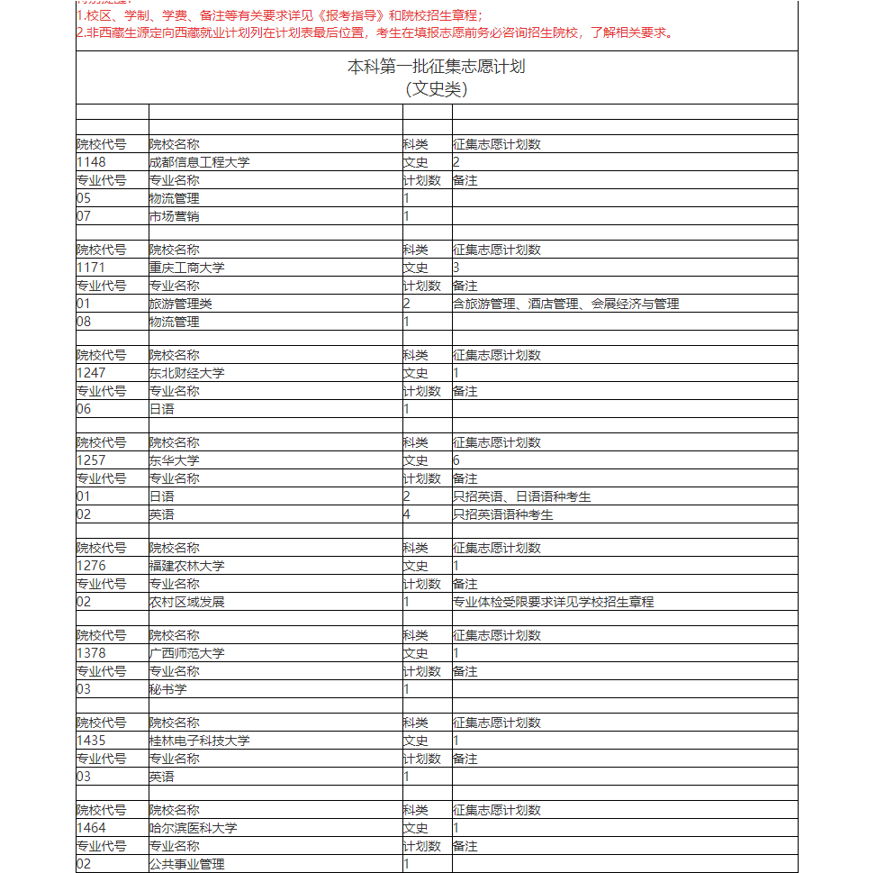 2023年二本征集志愿院校名单 文史类 院校代号 院校名称 科类 征集志愿计划数 1010 白城师范学院(中外合作) 文史 3 专业代号 专业名称 计划数 备注 8 学前教育(中外合作办学) 3 与韩国大邱加图立大学合作 院校代号 院校名称 科类 征集志愿计划数 1021 保定学院 文史 3 专业代号 专业名称 计划数 备注 2 供应链管理 1 5 人力资源管理 1 6 旅游管理与服务教育 1 院校代号 院校名称 科类 征集志愿计划数 1025 北海艺术设计学院 文史 12 专业代号 专业名称 计划数 备注 1 汉语国际教育 3 2 学前教育 3 3 哲学 2 4 汉语言文学 4 院校代号 院校名称 科类 征集志愿计划数 1026 北华大学 文史 2 专业代号 专业名称 计划数 备注 11 西班牙语 1 12 小学教育(师范) 1 院校代号 院校名称 科类 征集志愿计划数 1056 北京农学院 文史 2 专业代号 专业名称 计划数 备注 2 旅游管理(生态旅游) 2 院校代号 院校名称 科类 征集志愿计划数 1079 滨州学院 文史 2 专业代号 专业名称 计划数 备注 1 英语(师范) 2理科