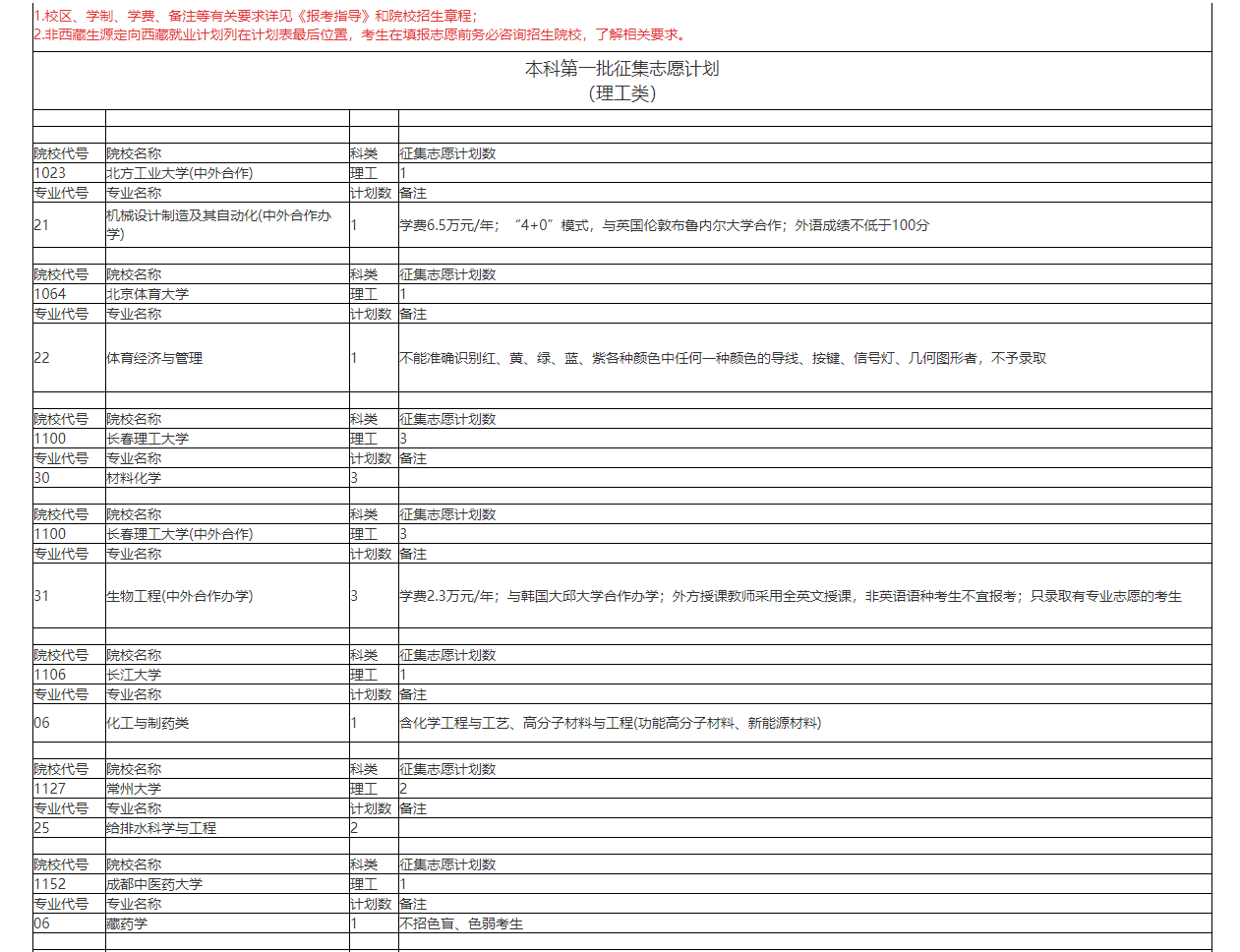 2023年二本征集志愿院校名单 理工类 院校代号 院校名称 科类 征集志愿计划数 1003 安阳工学院 理工 1 专业代号 专业名称 计划数 备注 8 交通运输(民航交通方向) 1 培养飞行签派、机场运行与管理方面相关人才 院校代号 院校名称 科类 征集志愿计划数 1010 白城师范学院(中外合作) 理工 4 专业代号 专业名称 计划数 备注 13 学前教育(中外合作办学) 4 与韩国大邱加图立大学合作 院校代号 院校名称 科类 征集志愿计划数 1022 北部湾大学 理工 2 专业代号 专业名称 计划数 备注 10 数学与应用数学(师范) 2 院校代号 院校名称 科类 征集志愿计划数 1022 北部湾大学(中外合作) 理工 1 专业代号 专业名称 计划数 备注 12 工程造价(中外合作办学) 1 学费6万元/年;实行“4+0”培养模式,4年学费均为6万元/年;学生4年均在学校学习,也可选择“3+1”模式,到东密歇根大学学习1年(赴美学习的1年不再额外收取学费);4年学习结束,符合条件者可获学校本科毕业证书、学位证书及美国东密歇根大学学士学位证书 院校代号 院校名称 科类 征集志愿计划数 1026 北华大学 理工 4 专业代号 专业名称 计划数 备注 41 学前教育(师范) 2 43 材料成型及控制工程 2 院校代号 院校名称 科类 征集志愿计划数 1026 北华大学(中外合作) 理工 1 专业代号 专业名称 计划数 备注 46 护理学(中外合作办学) 1 与芬兰于韦斯屈莱应用科技大学合作办学 院校代号 院校名称 科类 征集志愿计划数 1077 北京中医药大学东方学院 理工 1 专业代号 专业名称 计划数 备注 12 护理学 1 院校代号 院校名称 科类 征集志愿计划数 1083 渤海大学 理工 2 专业代号 专业名称 计划数 备注 26 应用化学 2 很赞哦! ()