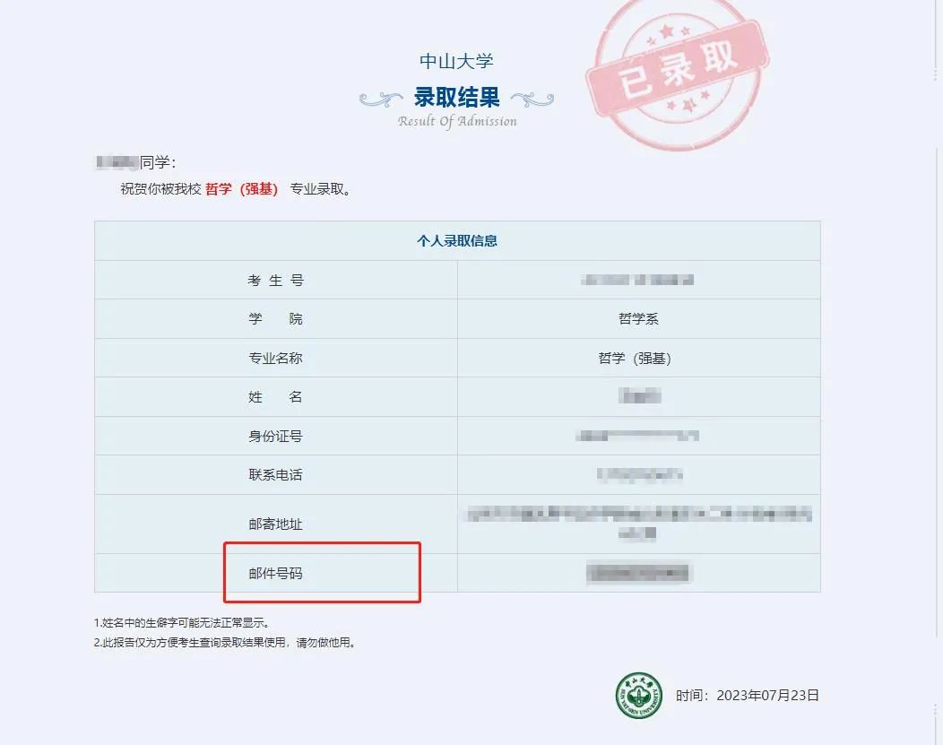 你的录取通知书将在收到本省(区、市)招生考试机构发送的官方录取信息后,约10天左右寄出。考生可在中山大学本科招生官网、中大招生公众号和小程序的“录取查询”栏目查询到通知书寄送进程及EMS邮件单号。