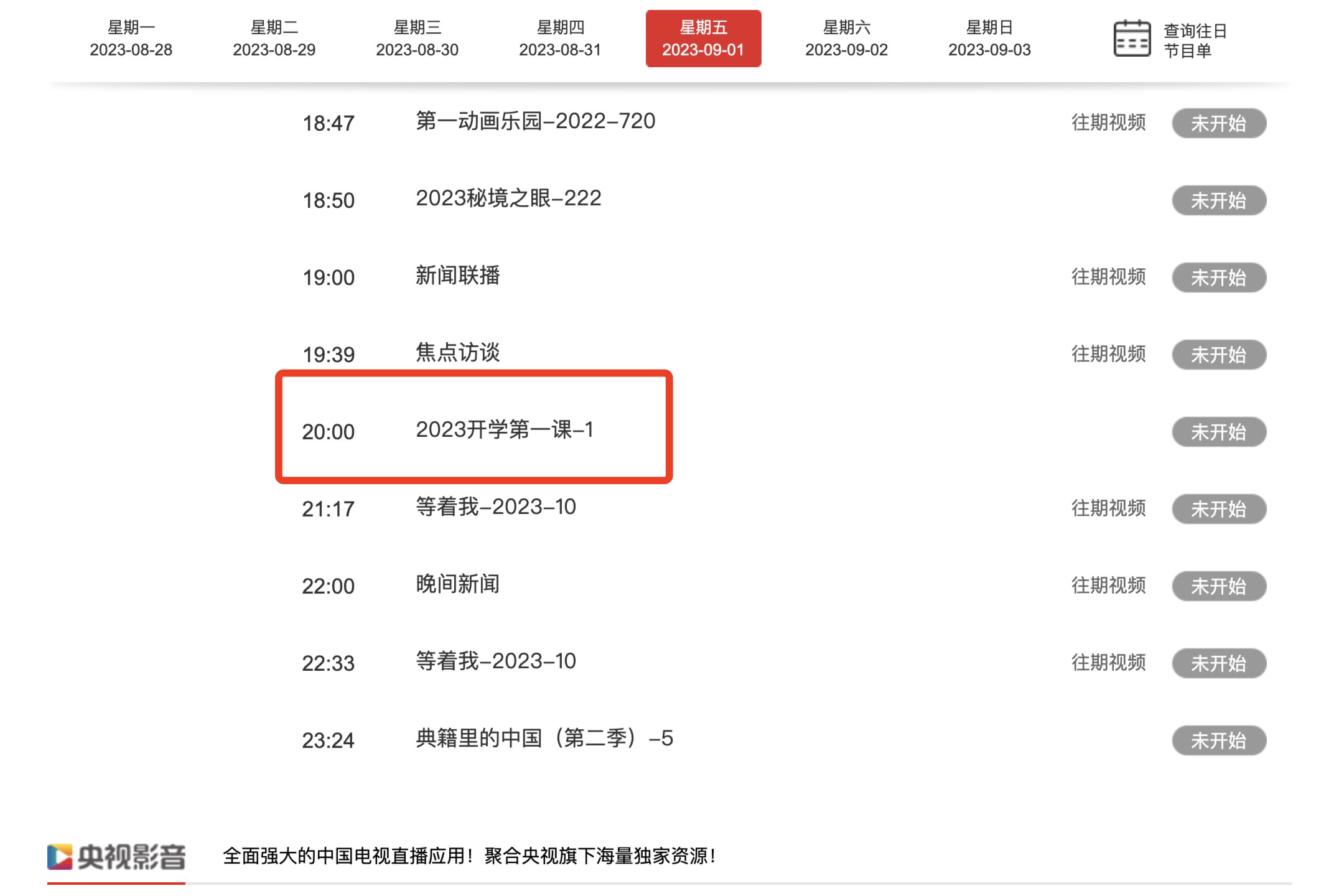 2023年央视秋季《开学第一课》将于2023年9月1日20:00在中央广播电视总台央视综合频道(CCTV-1)播出,并在央视频同步播出,点击下方提前锁定直播入口!