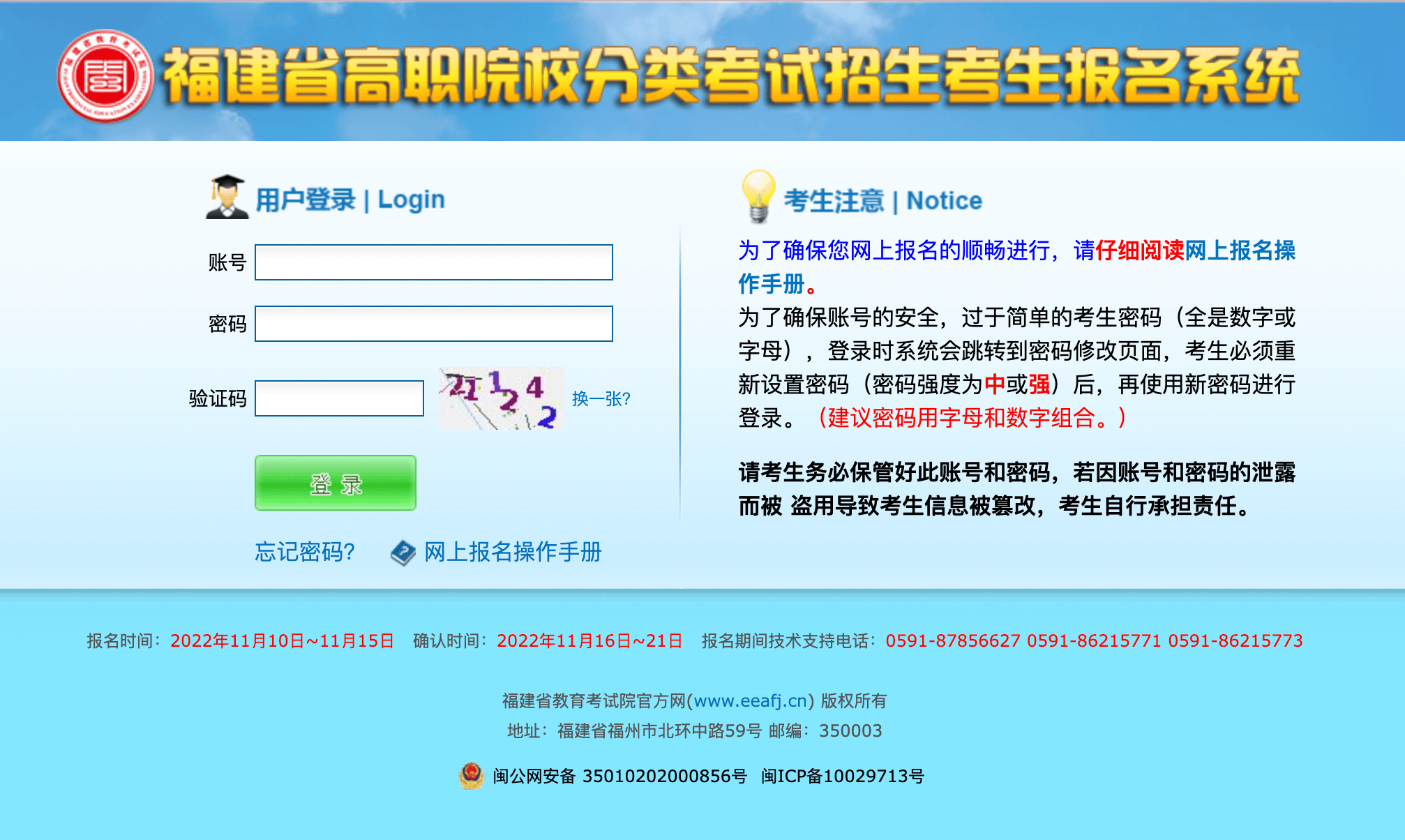 ◐◐◐◐●☛█▼▲◐◐◐◐●☛█▼▲◐◐◐◐●☛█▼▲东方金豪仕法律网WWW.dfjb.ne79110▲▼▲▼▲▼▲▼▲▼▲▼▲▼▲ 1.报考人员(含具有免试录取资格人员,下同)于2023年11月4日至11月10日登录福建省教育考试院网站(www.eeafj.cn)“数字服务大厅-高职分类招考-高职分类招考考生报名系统”进行网上报名,逾期不予受理。