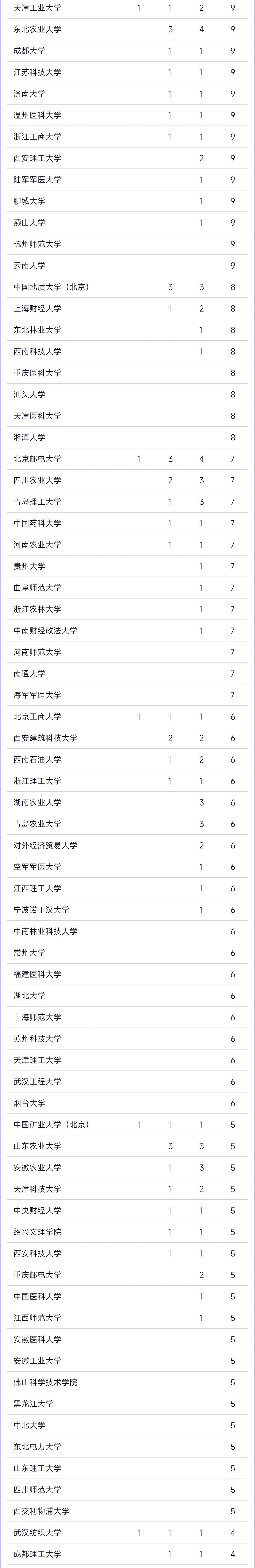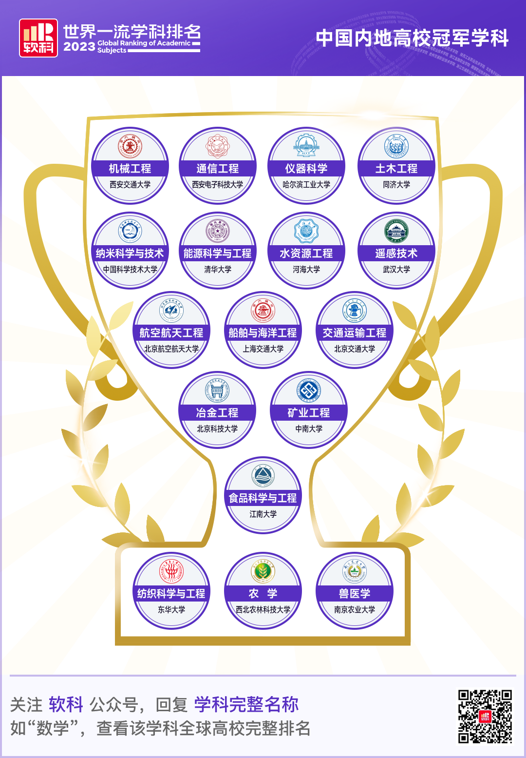 2023软科世界一流学科排名中,中国内地高校新增三个学科世界第一,东华大学在首次发布的纺织科学与工程学科中取得冠军席位,西北农林科技大学首次在农学学科排名世界第一,南京农业大学首次在兽医学学科排名世界第一。至此,中国内地高校在17个学科成为全球冠军,分别是清华大学(能源科学与工程)、西安交通大学(机械工程)、哈尔滨工业大学(仪器科学)、同济大学(土木工程)、河海大学(水资源工程)、江南大学(食品科学与工程)、北京航空航天大学(航空航天工程)、上海交通大学(船舶与海洋工程)、北京交通大学(交通运输工程)、武汉大学(遥感技术)、中南大学(矿业工程)、北京科技大学(冶金工程)、西安电子科技大学(通信工程)、中国科学技术大学(纳米科学与技术)、东华大学(纺织科学与工程)、西北农林科技大学(农学)、南京农业大学(兽医学)。