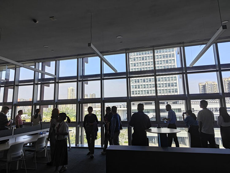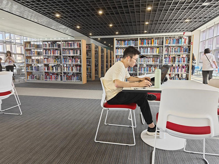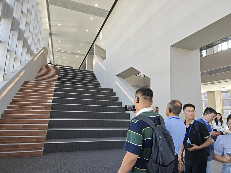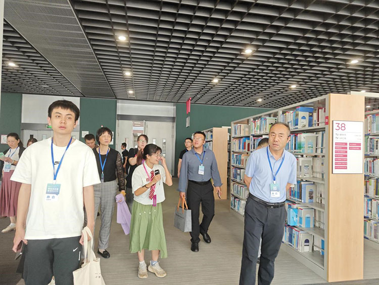 在讲解同学的带领下,老师们先后参观二楼宽阔大厅、三楼理工类藏书,到四楼体验了拥有绝佳景色的落地窗、自主学习区、休闲阅览区,以及网红阶梯、沉浸式阅览空间等。