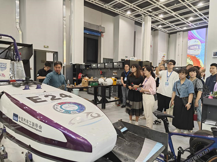 在深圳技术大学,来自全国各地30所多高校40多名参会老师在深圳技术大学教务部主任兼招生办公室主任刘宏伟教授陪同下,参观了创意设计学院展厅、图书馆、赛车工作室等场馆。