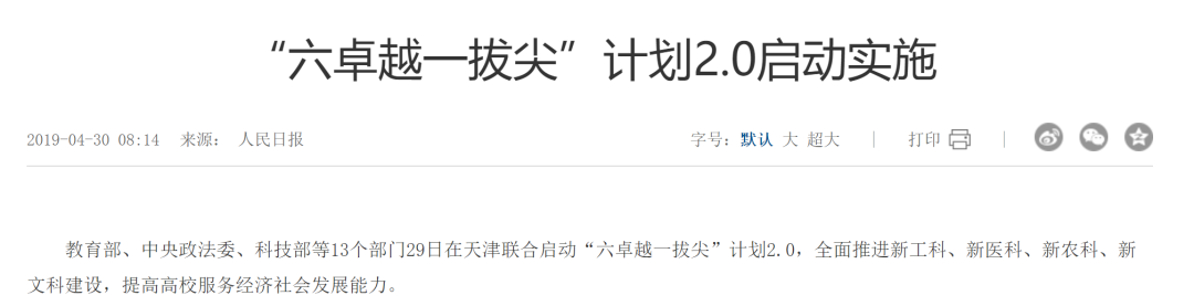2019年4月,教育部、中央政法委、科技部、工信部等13个部门已正式联合启动“六卓越一拔尖”计划2.0,其中突出提到了全面推进“新文科”建设。