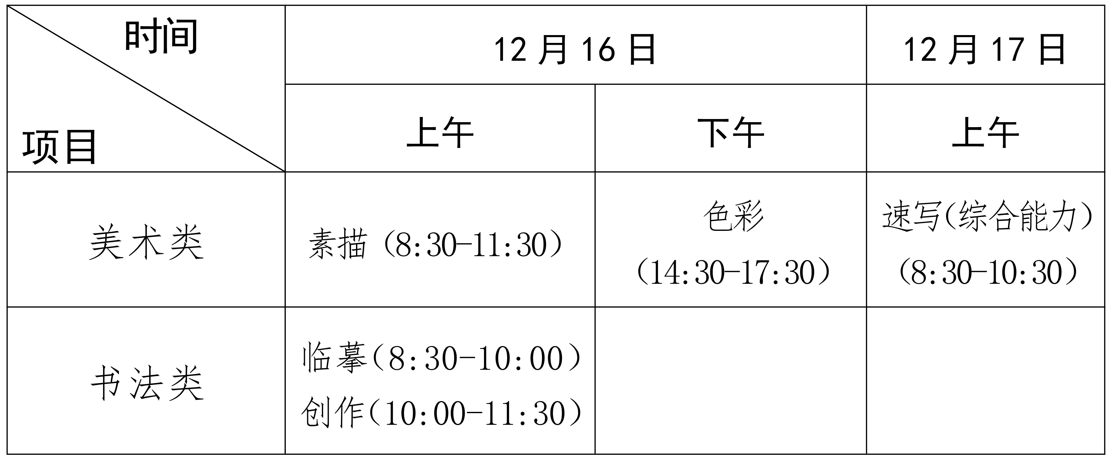 6.参加美术与设计类专业考试的考生自带画板、画笔、颜料等用品。参加书法类专业考试的考生自带毛笔、墨汁、画毡、黑色签字笔等用品。美术与设计类专业考试画纸由考点统一提供,尺寸为8开(270*390mm);书法类考试宣纸由考点统一提供,尺寸为四尺整张。