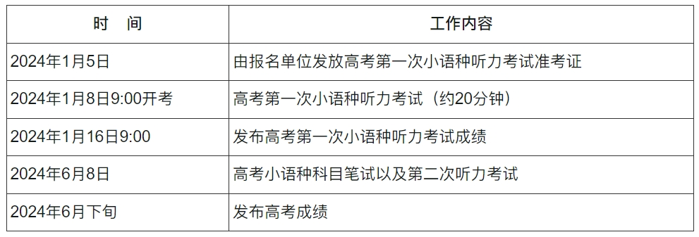 北京市2024年普通高等学校招生外语(非英语)(以下简称“小语种”)听力考试实行一年两考。第一次考试于2024年1月8日进行,考点集中安排在东城区、西城区、丰台区、石景山区、海淀区、通州区;第二次考试于2024年6月8日进行,考点由各区根据本区实际情况选定。具体日程安排如下。