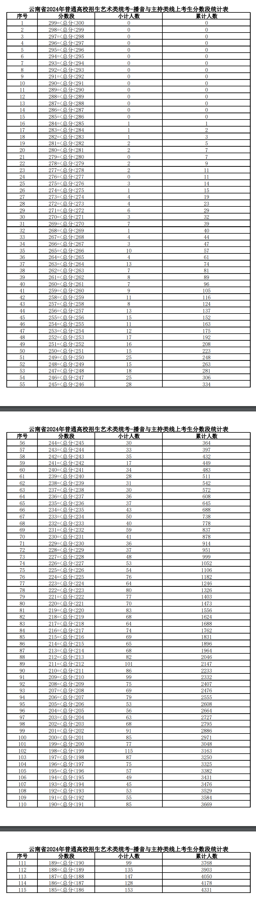 云南2024年艺考-播音与主持类线上考生分数段统计表 —掌上高考—中国教育在线