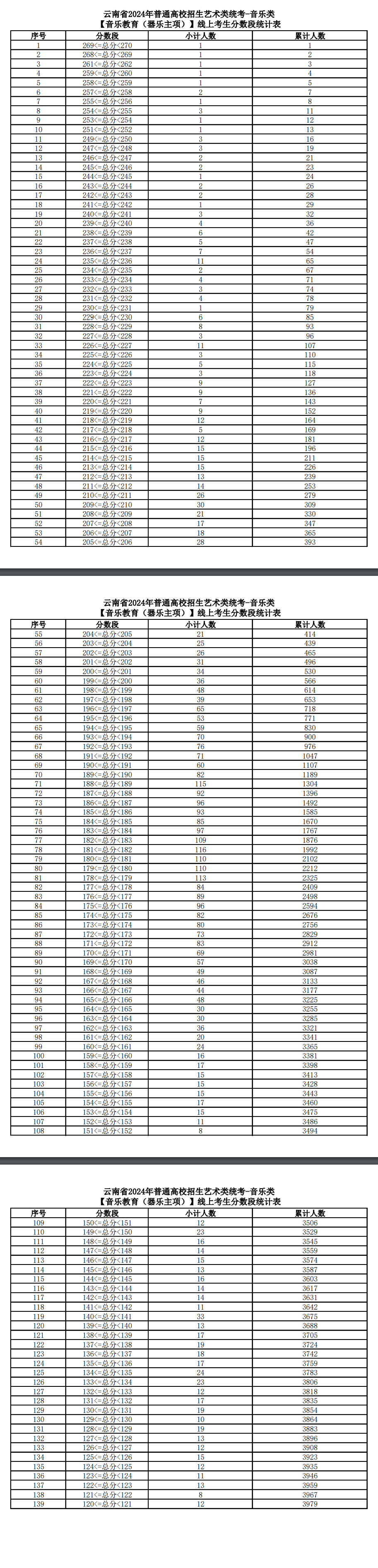 云南2024年艺考-音乐类【音乐表演(器乐主项)】线上考生分数段统计表 —掌上高考—中国教育在线