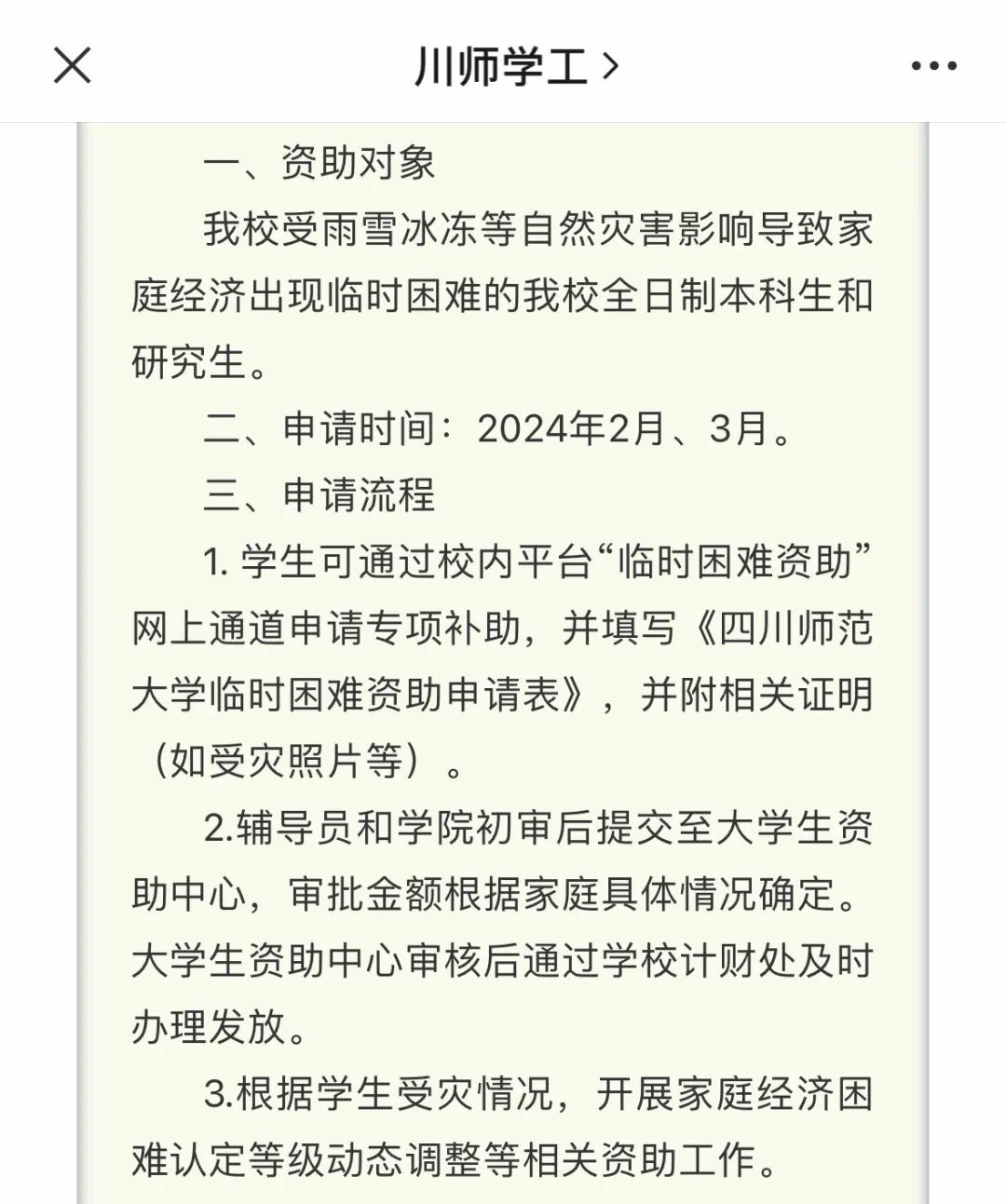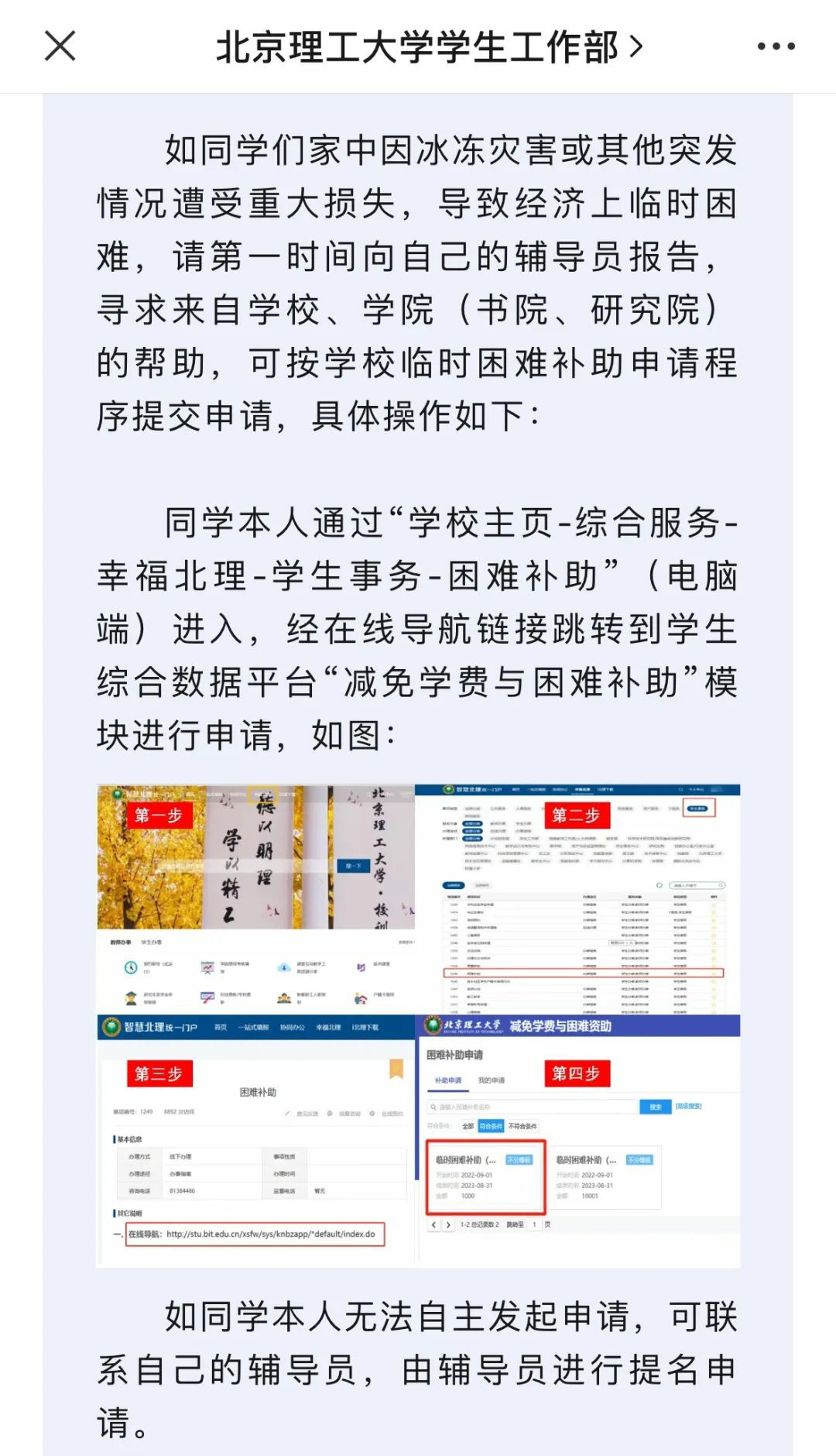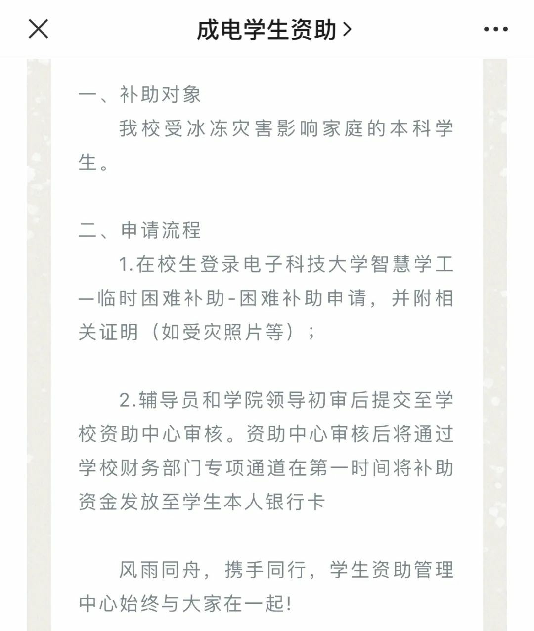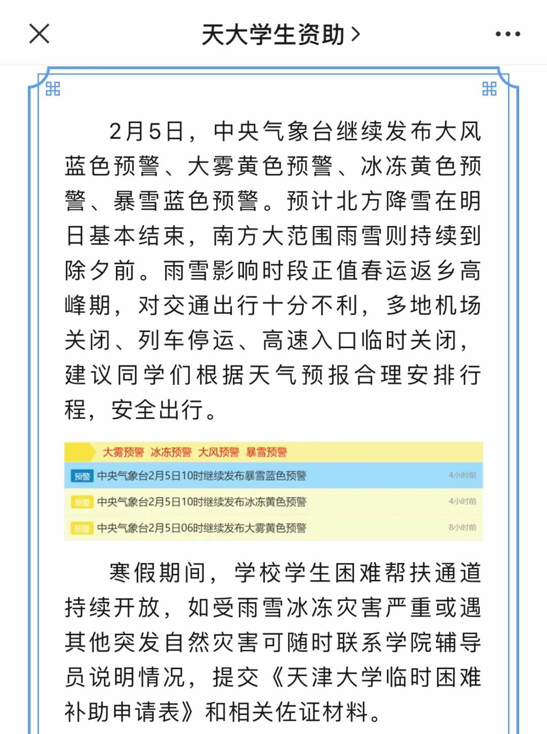 清华大学时刻牵挂着每一位受灾害影响的同学,现已设立冰冻灾害临时困难补助通道并在假期中持续开放,同学可根据需要及时申请。