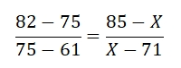 第一步,将该科目所有考生原始分从高到低进行排序,按照规定的等级比例该考生被划定为B等级,该科目B等级原始分区间为61-82(仅是示例,实际各科目各等级原始分区间不固定),即Y1、Y2分别为61和82;