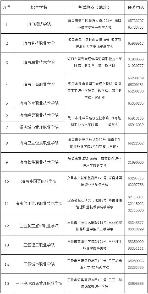 海口经济学院、海南科技职业大学、海南职业技术学院、海南工商职业学院、海南经贸职业技术学院、海南卫生健康职业学院、海南软件职业技术学院、海南外国语职业学院、海南健康管理职业技术学院、三亚航空旅游职业学院、三亚理工职业学院、三亚城市职业学院、三亚中瑞酒店管理职业学院等13所学校,具体考试地点详见准考证。