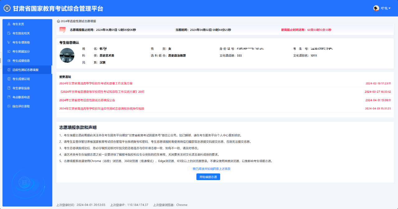 填报信息页包含:志愿填报时间、考生信息、通知公告、志愿填报条款和声明、考生登录信息。
