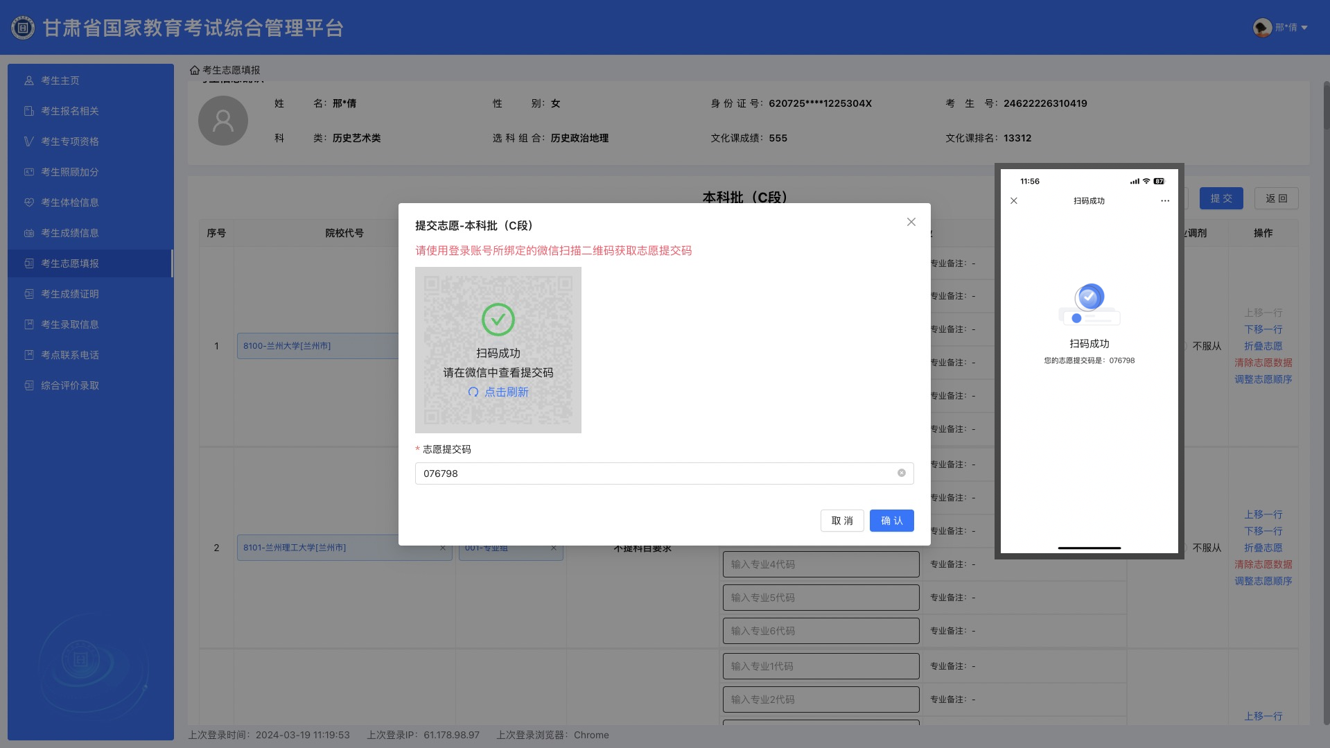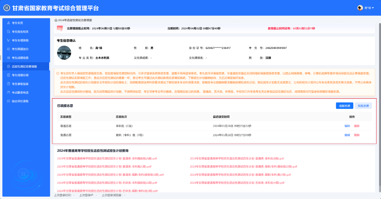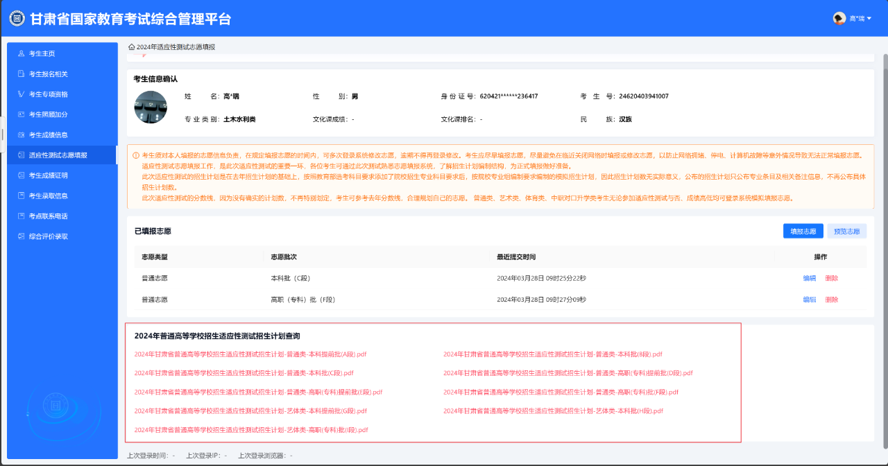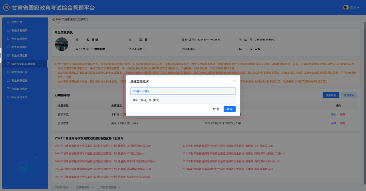 2024年甘肃省普通高等学校招生适应性演练志愿填报系统使用手册