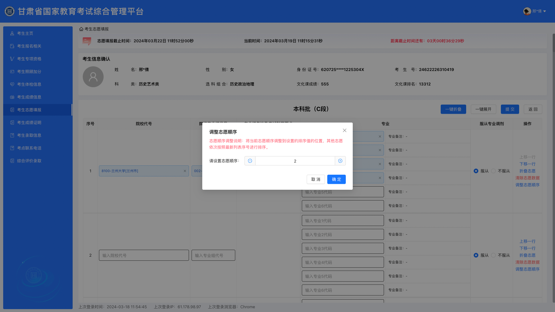 考生可以通过上移一行、下移一行、调整志愿顺序按钮修改志愿顺序,其中调整志愿顺序可以将当前志愿顺序调整到设置的排序值的位置,其他志愿依次按照最新列表序号进行排序。