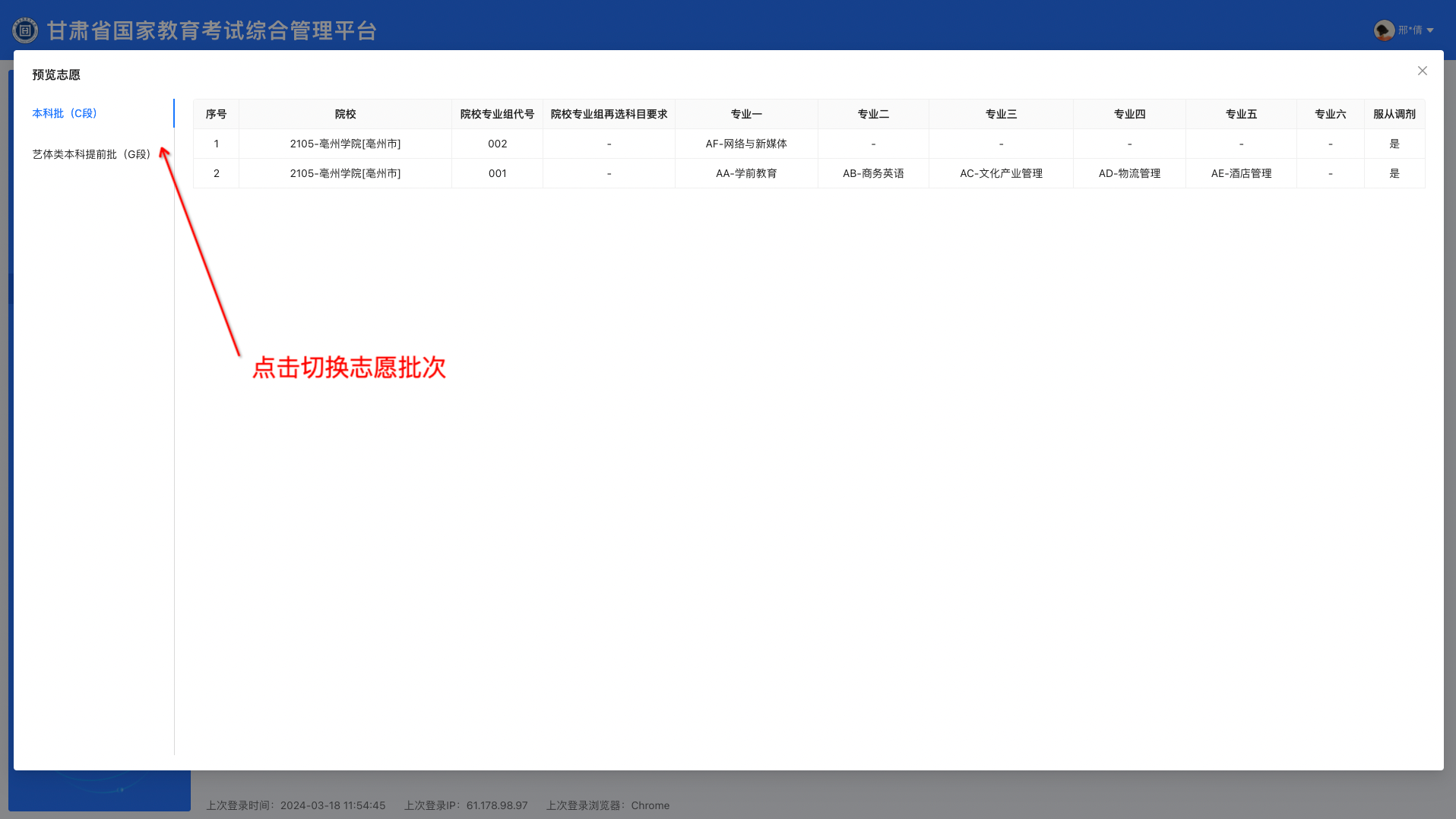考生通过点击右侧《预览志愿按钮》,弹出已填报的志愿预览页面。在弹出页面左侧是志愿批次的列表,通过点击对应批次切换当前预览的志愿内容。