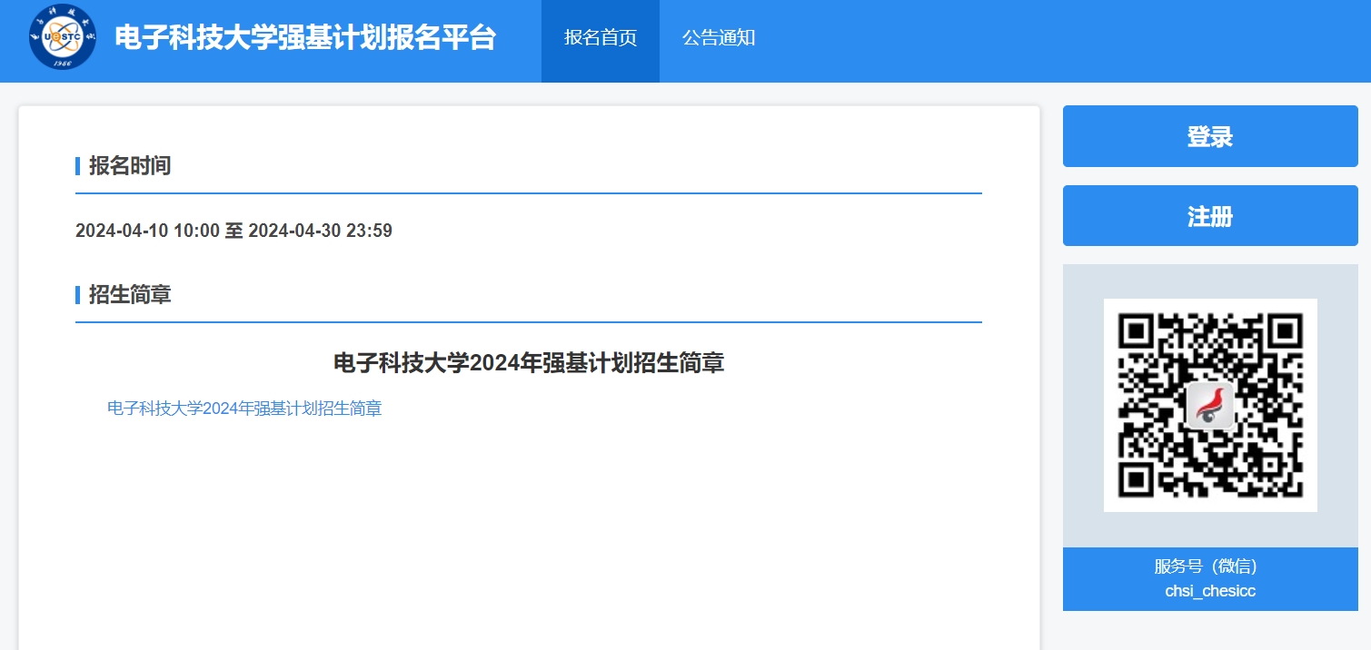 - 电子科技大学2024年强基计划报名入口:https://bm.chsi.com.cn/jcxkzs/sch/10614 —掌上高考—中国教育在线