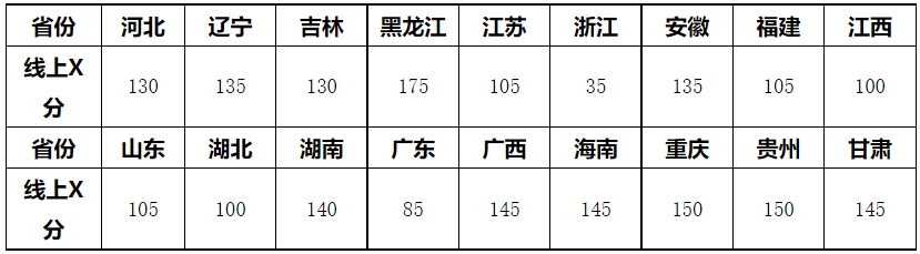 高考综合改革省份获得我校高校专项计划资格的考生,高考成绩(不含任何政策性加分)达到所在省相关特殊类型录取控制分数线上一定分值,予以录取,具体分值如下: