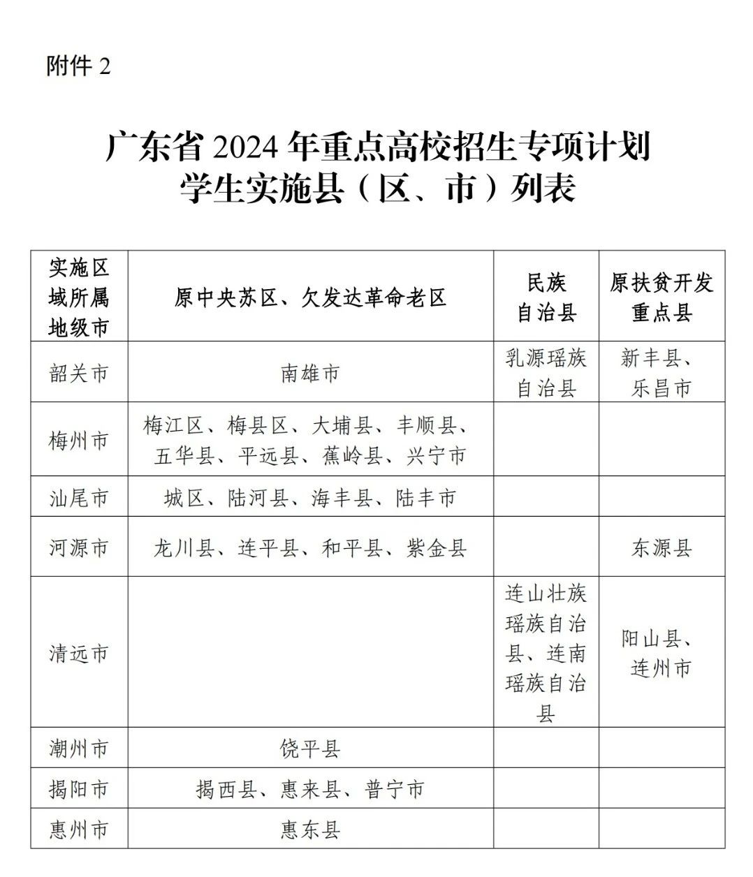 2.广东省2024年重点高校招生专项计划实施县(区、市)列表