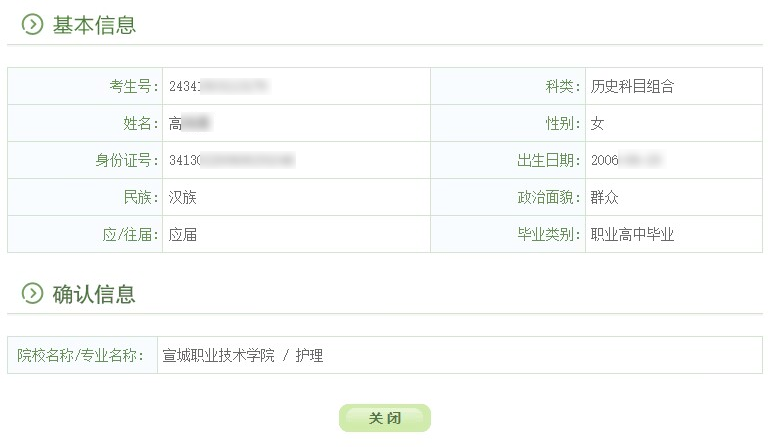 2.用自己设定的密码重新登录,进入录取院校确认界面(示例):