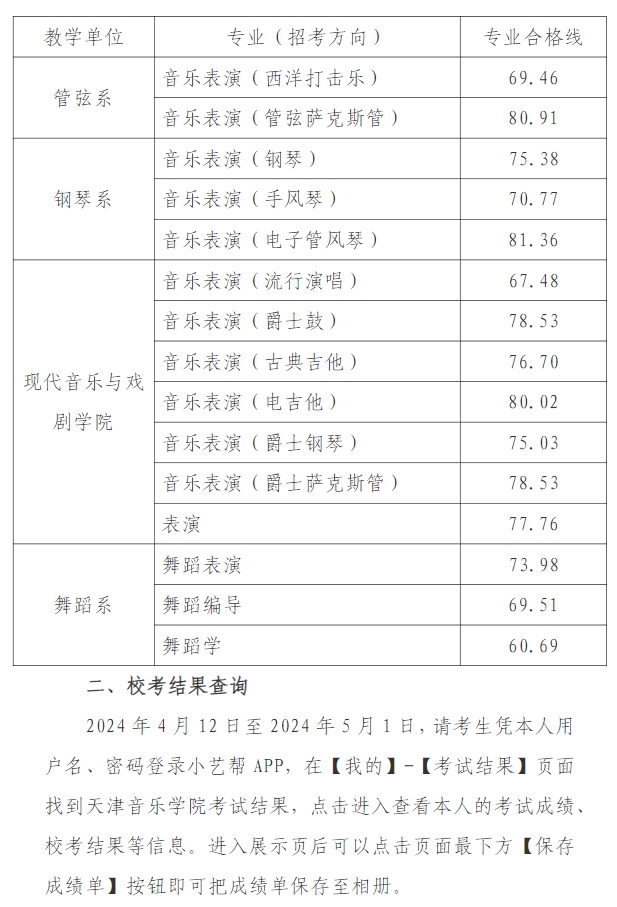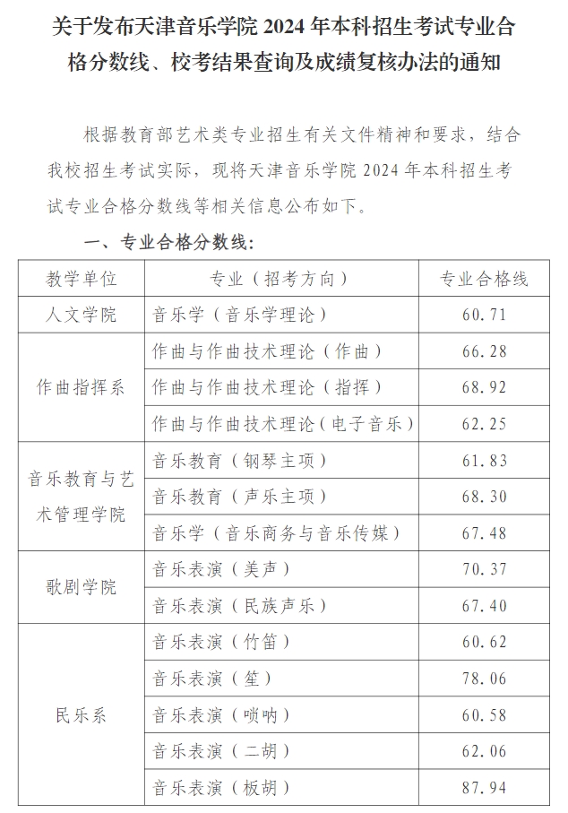 天津音乐学院2024年本科招生艺考校考合格线公布 —掌上高考—中国教育在线