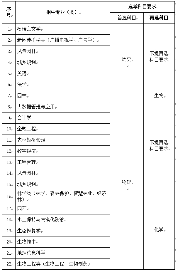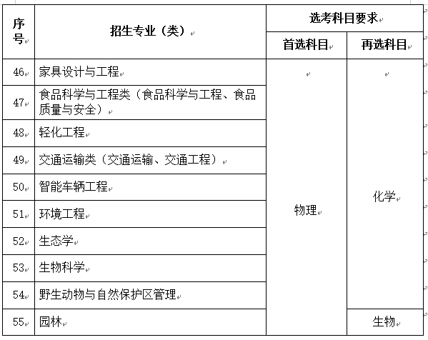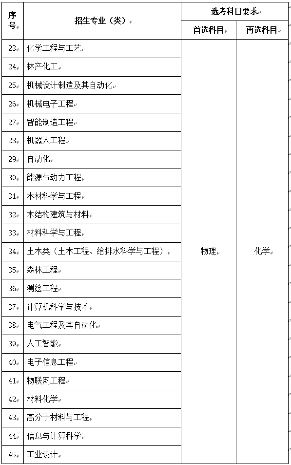 温馨提示:高三二模成绩已出,点击此处,测测你的分数,能上哪些大学!根据国家经济社会发展需要,结合我校学科优势和专业特色,特向考生开放"林业工程"国家"双一流"建设学科所涵盖的本科专业以及国家级、省级一流本科专业等优势及特色专业。学校现有国家级一流专业建设点31个,国家级特色专业建设点6个,省级一流专业建设点18个。2024年综合评价招生专业详见下图,考生高中学业水平选择性考试科目应符合填报专业(类)的选考科目要求,本年度招生专业最终以省级招生主管部门公布为准。以报名条件(四)"创新潜质类"报名