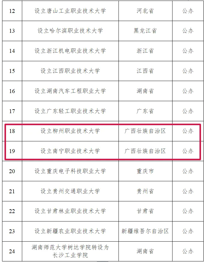 5月15日,教育部发布《关于拟同意设置本科高等学校的公示》,根据《中华人民共和国高等教育法》《普通高等学校设置暂行条例》《普通本科学校设置暂行规定》《本科层次职业学校设置标准(试行)》等有关规定以及第八届全国高等学校设置评议委员会考察评议结果,经教育部党组会议审议,拟同意设置康复大学等24所学校,现予公示。其中,广西有两所高校在列:南宁职业技术大学、柳州职业技术大学。