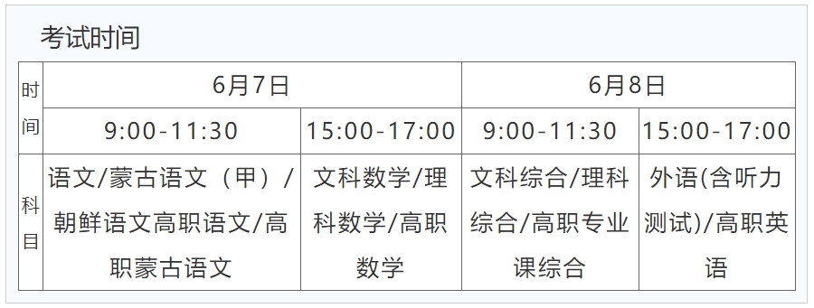 内蒙古高考考试科目为:语文、数学(文/理)、综合(文/理)、外语