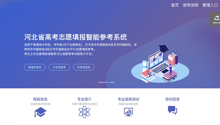 温馨提示:高考进行中。测一测,你的分数,能上哪些大学?6月10日开始,河北省高考志愿填报智能参考系统(以下简称参考系统)面向河北省高考考生免费开放体验。考生可输入http://www.hbzyck.com登录系统,用户名为考生号,系统初始密码为身份证号码后六位。体验期将持续至6月15日。