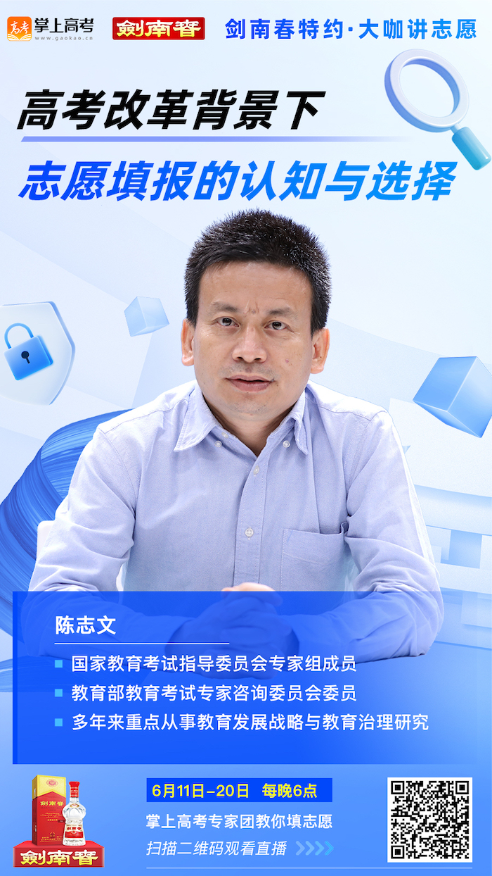 6月11日18点,中国教育在线总编辑、国家教育考试指导委员会专家组成员、教育部教育考试专家咨询委员会委员陈志文老师,将以“高考改革背景下志愿填报的认知与选择”为主题,为大家带来志愿填报的精彩分享,一起来看看都有哪些重点吧。