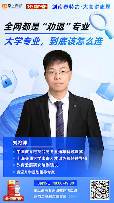 6月15日18点,中国教育电视台高考直通车特邀嘉宾、上海交通大学未来人才训练营特聘导师、教育发展研究院副院长、资深升学规划指导专家刘将帅老师,将以“全网都是“劝退”专业,大学专业,到底该怎么选”为主题,为大家带来志愿填报的精彩分享。