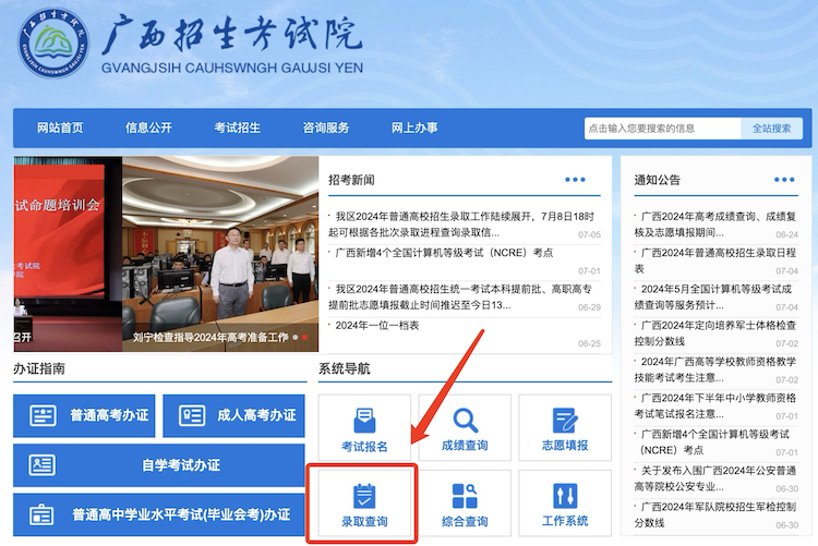 考生可登录“广西招生考试院”网站(https://www.gxeea.cn)的“系统导航—录取查询—2024年普通高等学校招生录取信息查询”栏目,输入本人报名号、身份证号、手机验证码(验证码发至考生高考报名时绑定的手机号),点击“提交”,即可查询今年个人普通高校招生投档、录取信息。